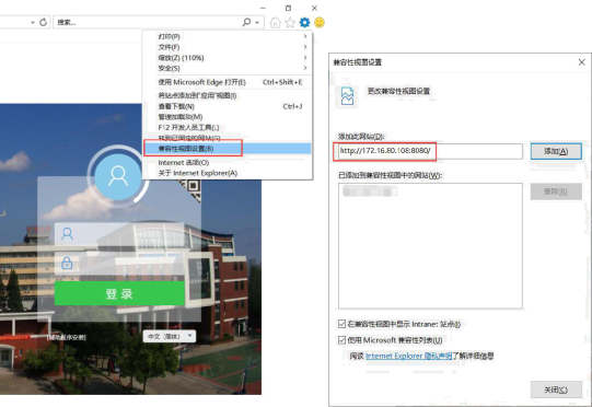 首次使用前设置:以IE 浏览器为例,点击右上角设置,选择“兼容性视图”,点击添加【http://172.16.80.108:8080】设置结束。