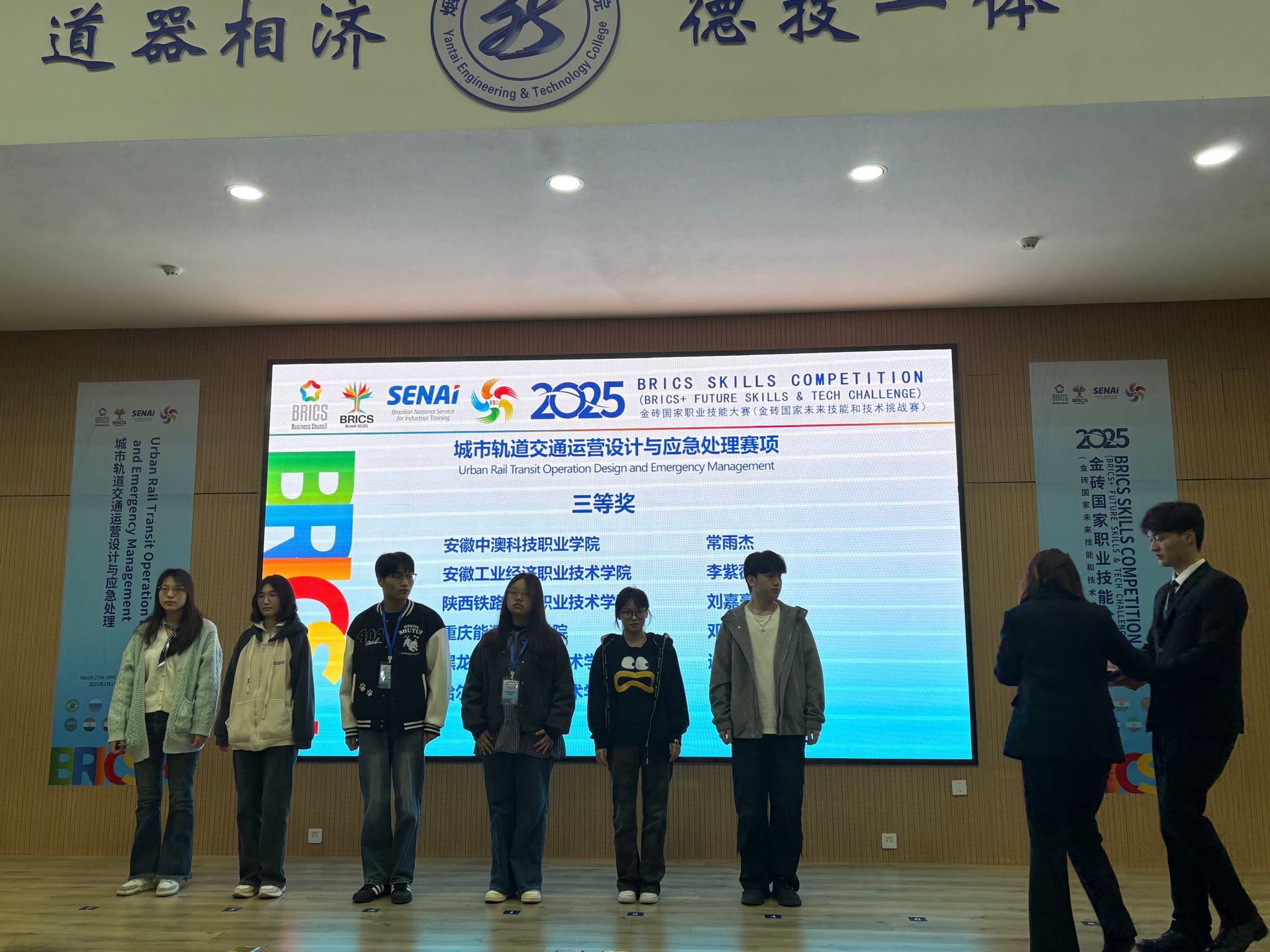 2026年3月27日至29日,在烟台工程职业技术学院举办的2025金砖国家职业技能大赛城市轨道交通运营设计与应急处理赛项国际总决赛中,安徽中澳科技职业学院现代服务学院代表队凭借扎实的专业技能和稳定的现场发挥,荣获三等奖。此次获奖是学院深入推进“以赛促学、以赛促教”教学改革的成果体现,也彰显了学院在服务现代交通运输产业、培养高素质技术技能人才方面的积极探索。