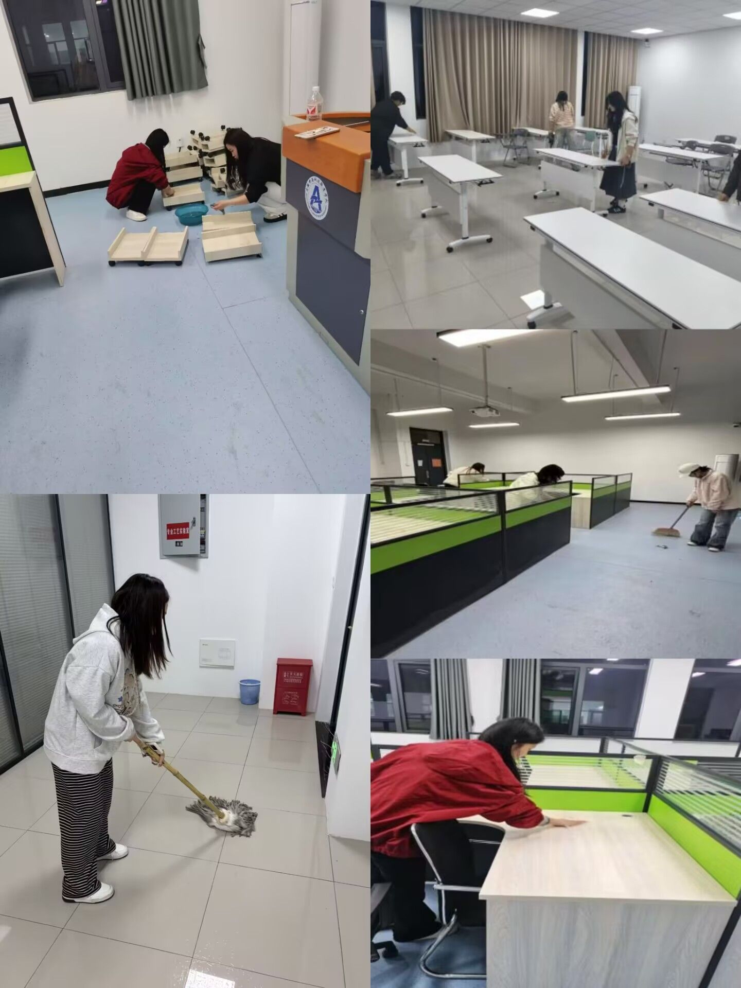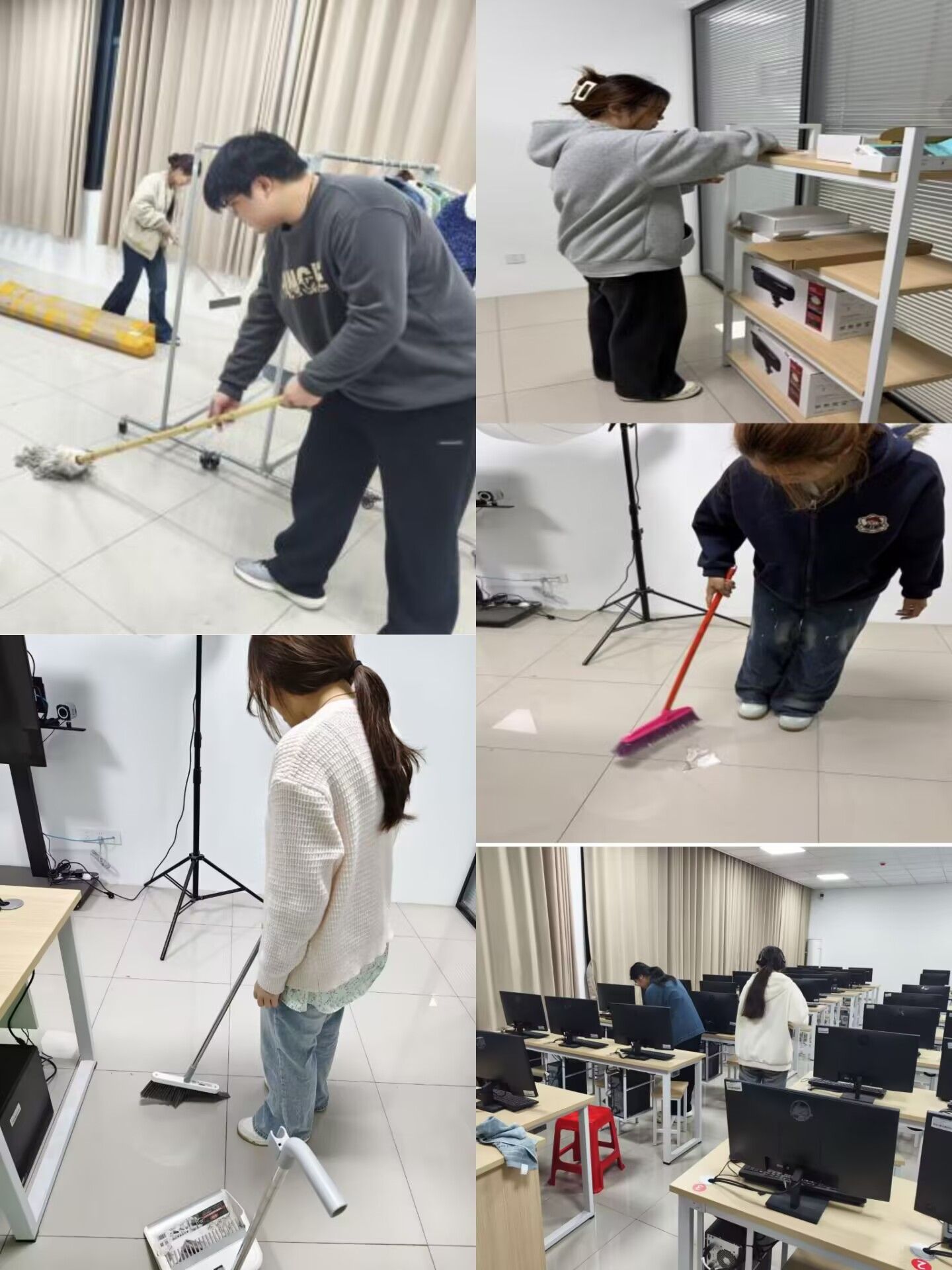 清扫过程中,大家分工协作、配合默契,充分发扬不怕苦、不怕累、不怕脏的奉献精神。有的拿起抹布,仔细擦拭教室的门窗、桌椅、讲台以及窗台灰尘,不放过任何一处污渍;有的手持清扫工具,认真清扫地面垃圾、纸屑与杂物,将角落堆积的灰尘彻底清理干净;还有的主动整理教室内零散物品,归置桌椅,让整体环境更加整齐有序。大家各司其职、干劲十足,经过共同努力,这些教室及周边公共区域焕然一新,这为后续师生开展实训教学、学习活动营造了干净、整洁、舒适的环境。