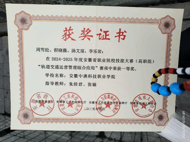 大二学年,获得 2024-2025 学年国家奖学金、学院奖学金一等奖、安徽省 “中银杯” 城市轨道交通运营管理综合应用省级一等奖、法制宣传手册绘画制作比赛一等奖、广播体操比赛三等奖、广场舞比赛二等奖、雷锋主题朗诵活动二等奖、“强国复兴有我”活动最佳表演奖、青春思政课暨文艺汇演优秀表演者;