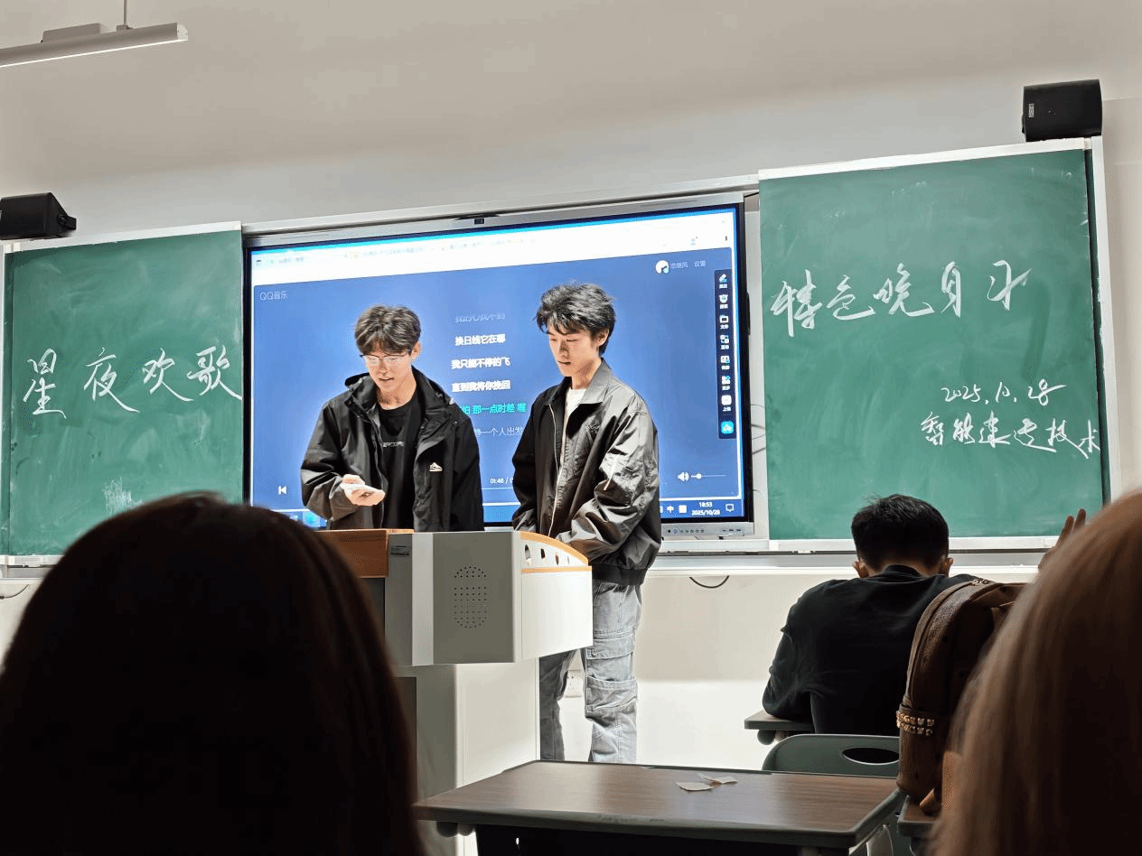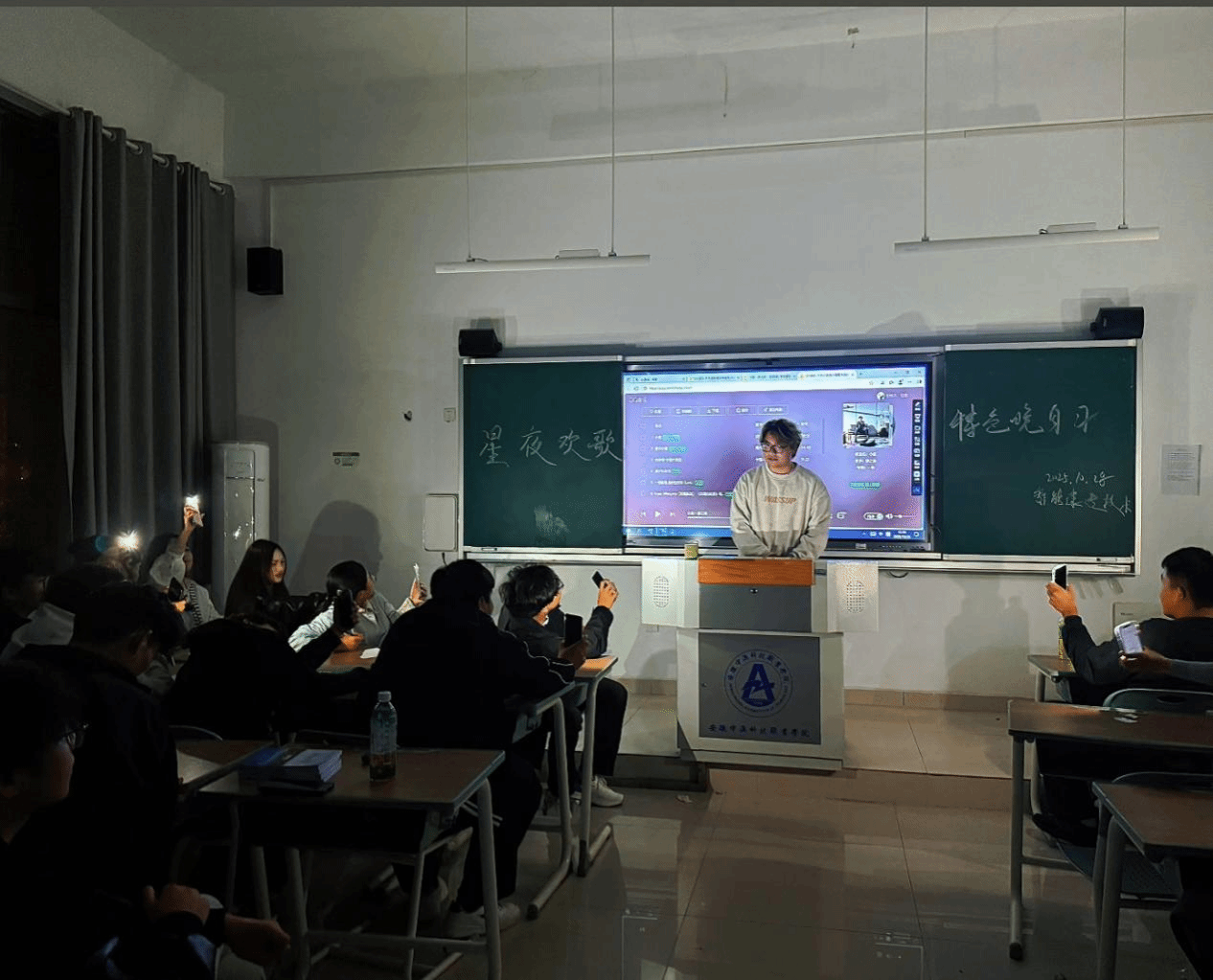 随着教室灯光渐暗,暖黄色的氛围灯点亮,活动在18:30正式拉开帷幕。活动现场,同学们热情高涨,踊跃报名登台演唱。从经典老歌到流行金曲,从激昂励志的旋律到温柔抒情的曲调,每一首歌曲都展现着同学们擅长的不同音乐风格与青春态度。来自班级的高寅鑫同学与何严俊杰同学带来了一首舒缓的歌曲《爱你没差》,这首歌瞬间点燃全场气氛,拉近了彼此的距离;孔令泽同学带来一首《背对背拥抱》,他用轻柔的嗓音搭配简单的吉他伴奏,将现场氛围带入温馨浪漫的情境,台下同学纷纷挥舞手机闪光灯,宛如一片 “星海”;还有同学选择演唱励志歌曲《追梦赤子心》,用充满力量的歌声传递着对未来的憧憬与坚持,引发了在场同学的强烈共鸣。