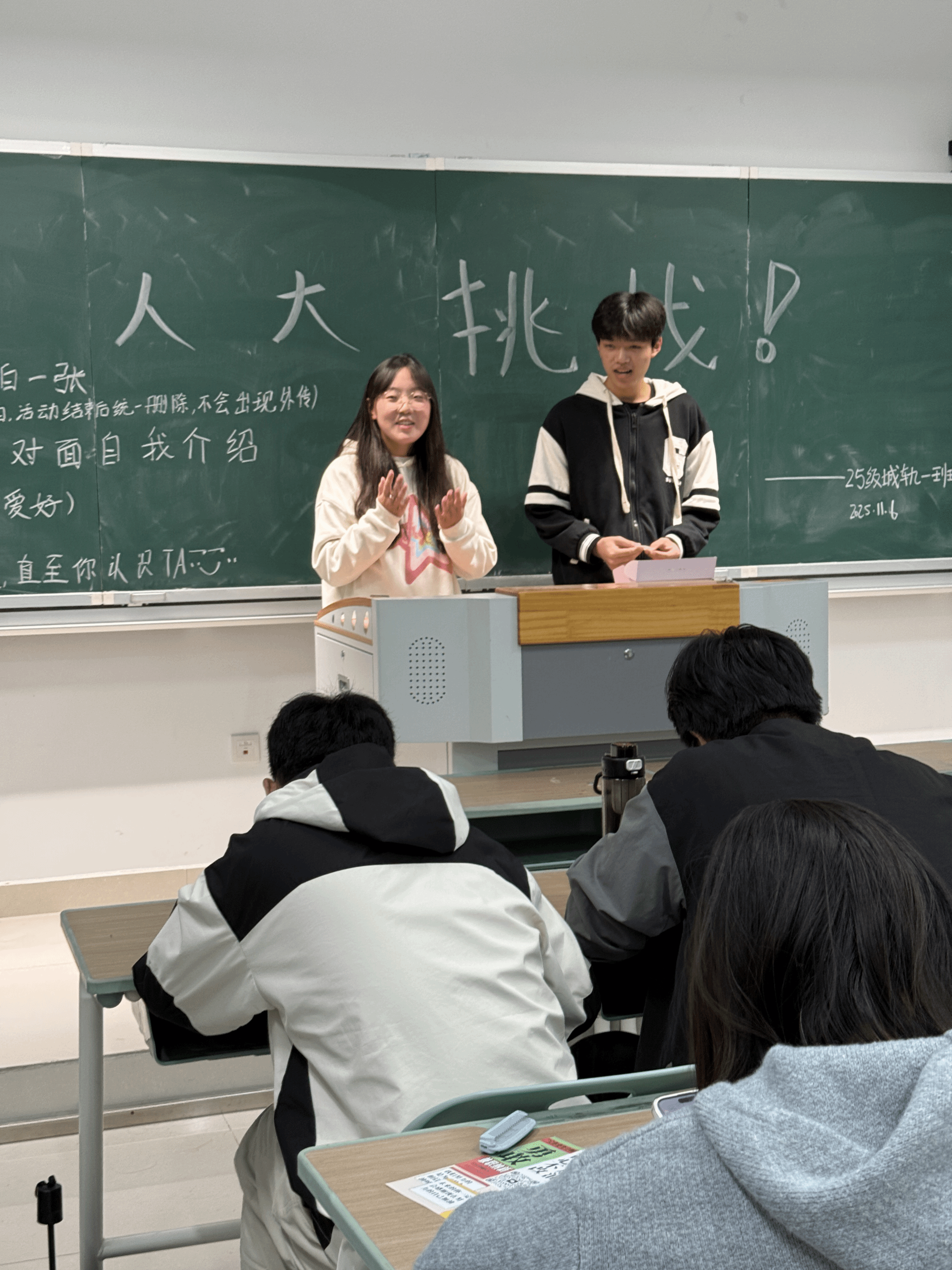为打破班级同学间的陌生感,11月6日晚,25级城轨1班在A306教室开展“班级认人大挑战”趣味互动活动,助力同学们快速融入集体。班级共52人参与。
