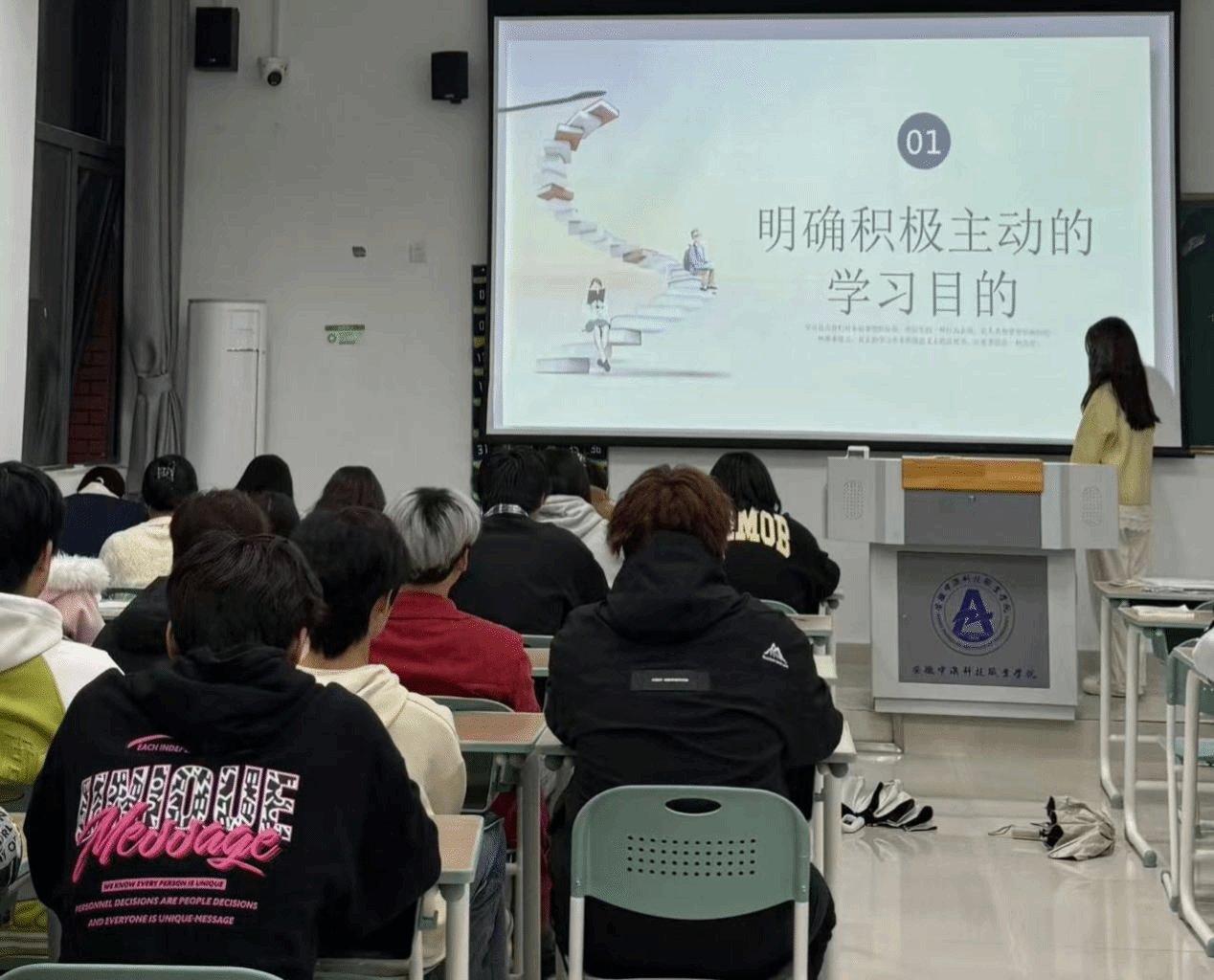 活动现场,宣传委员走上讲台,以精心制作的PPT为载体,带来了一场场干货满满的学习分享。从“明确积极主动的学习目的”的认知引导,到“学习-思考-分享”闭环的方法构建,宣传委员结合自身学习经历,将抽象的学习理念转化为可操作的实践路径。台上讲解者思路清晰、案例鲜活,台下同学们专注聆听、积极互动,教室中弥漫着浓厚的求知氛围。在互动环节,同学们就“如何保持长期学习动力”“学科难点如何突破”等问题踊跃提问,宣传委员和组织委员一一耐心解答,现场交流热烈而深入。