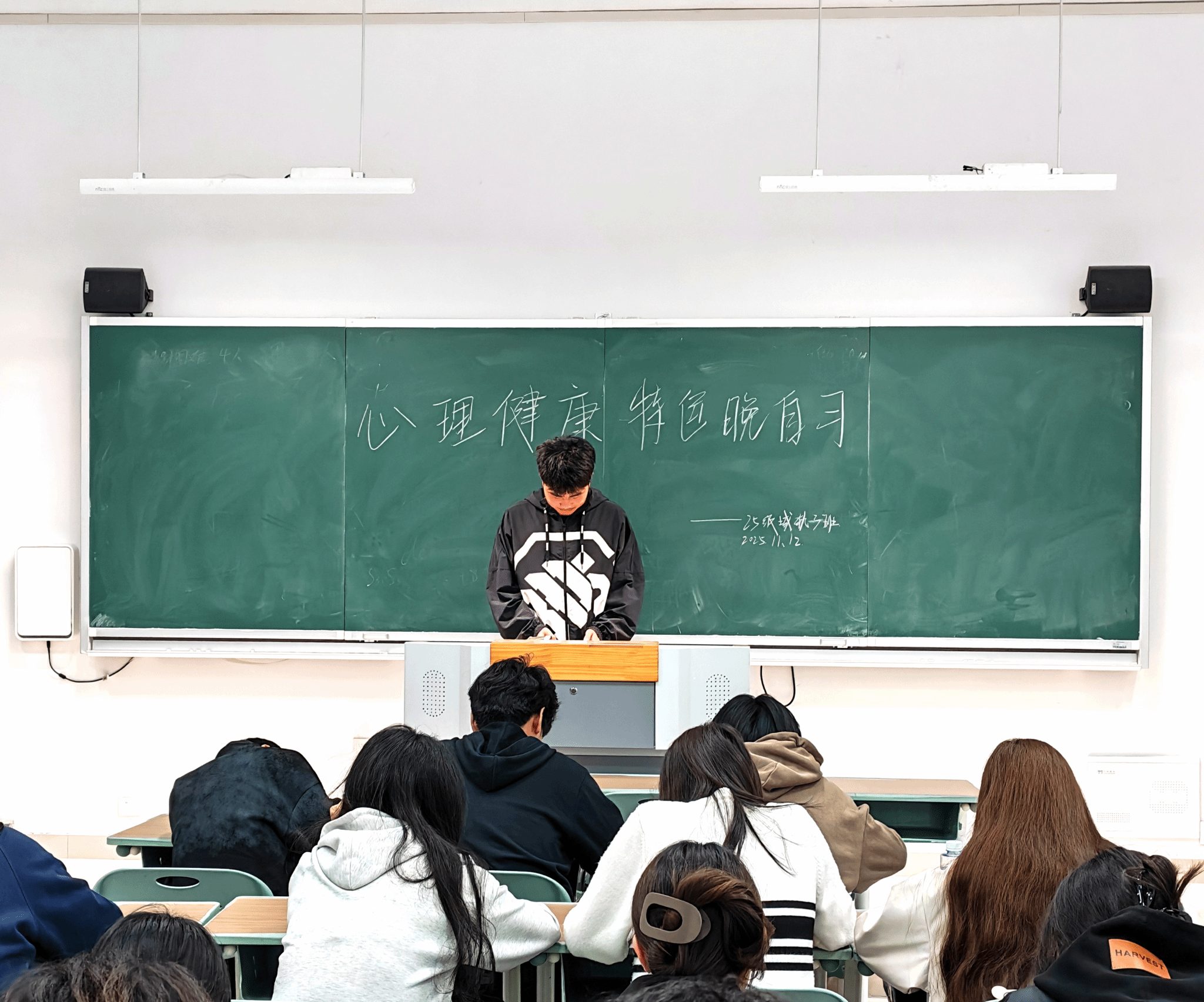 为了进一步加强班级心理健康教育工作,帮助同学们缓解学业压力、调节心理状态,营造积极健康、互助友爱的班级氛围。25级城轨3班于2025年11月12日晚,在教学楼A309教室开展“心理健康”主题教育活动,让同学们在互动交流中汲取能量,在心灵碰撞中收获成长力量。本次活动由心理委员刘若文负责,全班共50名同学参与。