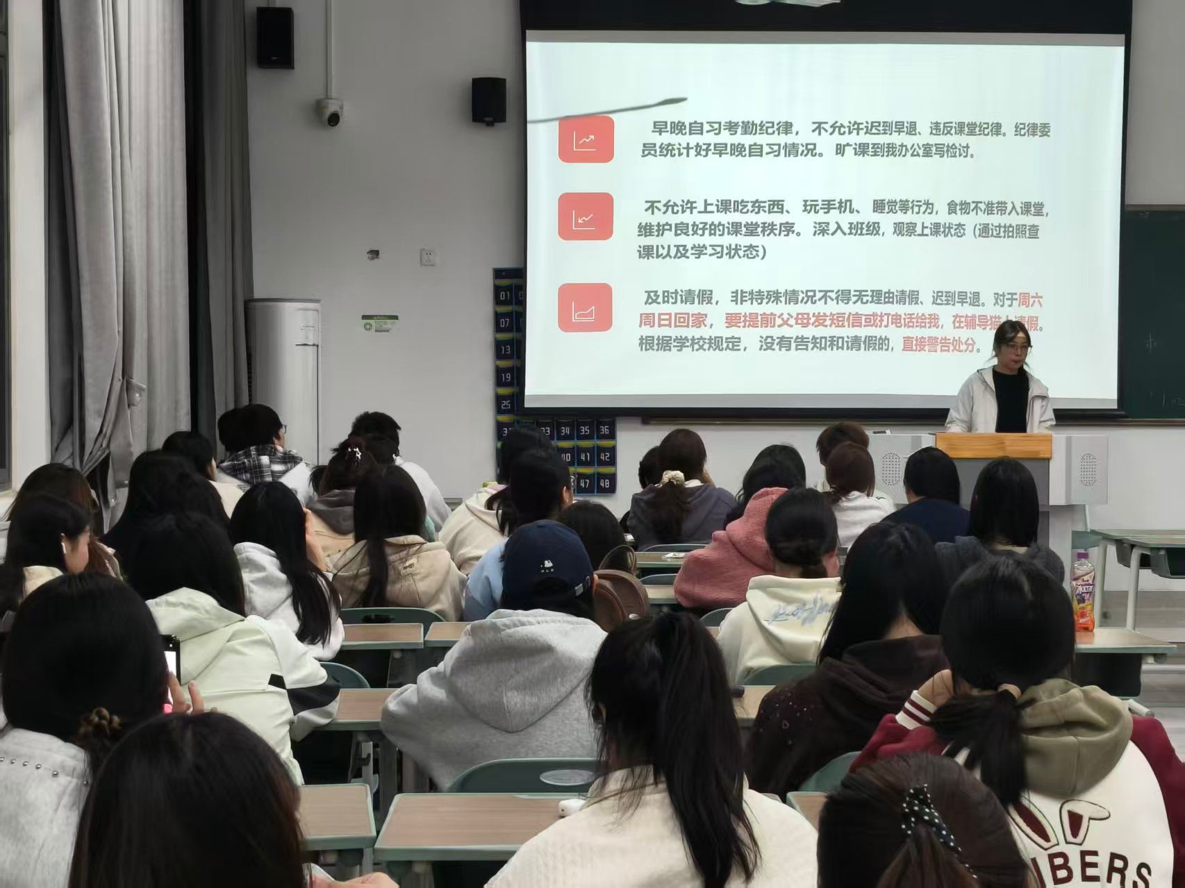在纪律规范方面,辅导员高洁通报了近期课堂出勤与宿舍卫生情况。她严肃批评了部分同学存在的旷课行为,并明确以下几点要求:一是严格执行早晚自习考勤制度,杜绝迟到、早退,纪律委员需如实记录并上报,屡教不改者将进行书面检讨;二是严禁上课期间吃东西、玩手机、睡觉等不良行为,辅导员将不定期深入课堂检查;三是规范请假流程,假期离校需及时报备。