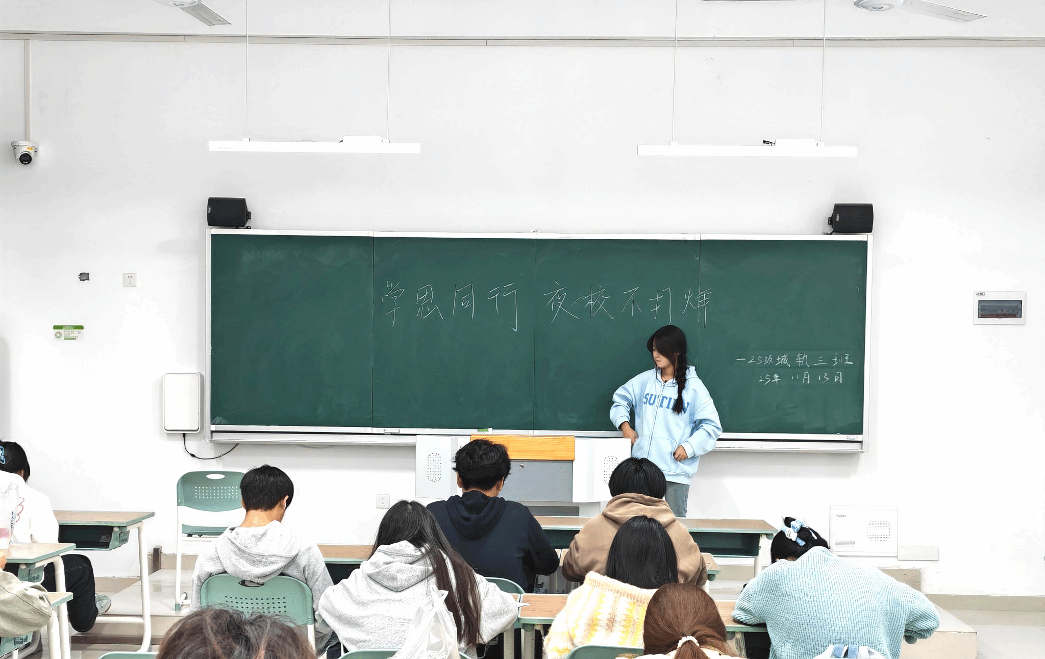 为了营造浓厚学习氛围、激发自主学习动力、促进同学间的互助共进,25级城轨3班于2025年11月13日晚,在教学楼A309教室创新性开展“学思同行,夜校不打烊”特色晚自习活动,将传统晚自习升级为集自主研习、难题攻坚、思想碰撞于一体的有趣空间,让每一个夜晚都成为沉淀知识、提升自我的黄金时光。本次活动由班长张诗语负责,全班共50名同学参与。