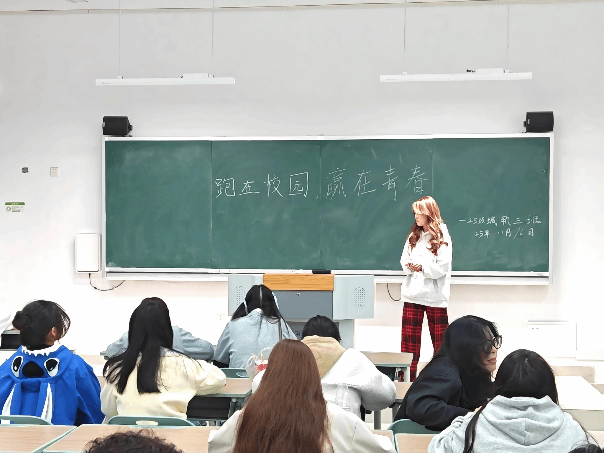 为了打破传统晚自习的氛围,丰富课余生活,增强班级凝聚力,25级城轨3班于2025年11月16日在教学楼A309教室开展以“跑在校园,赢在青春”为主题的特色晚自习活动,让青春活力在校园赛道上尽情绽放。本次活动由班长张诗语负责,全班共50名同学参与。