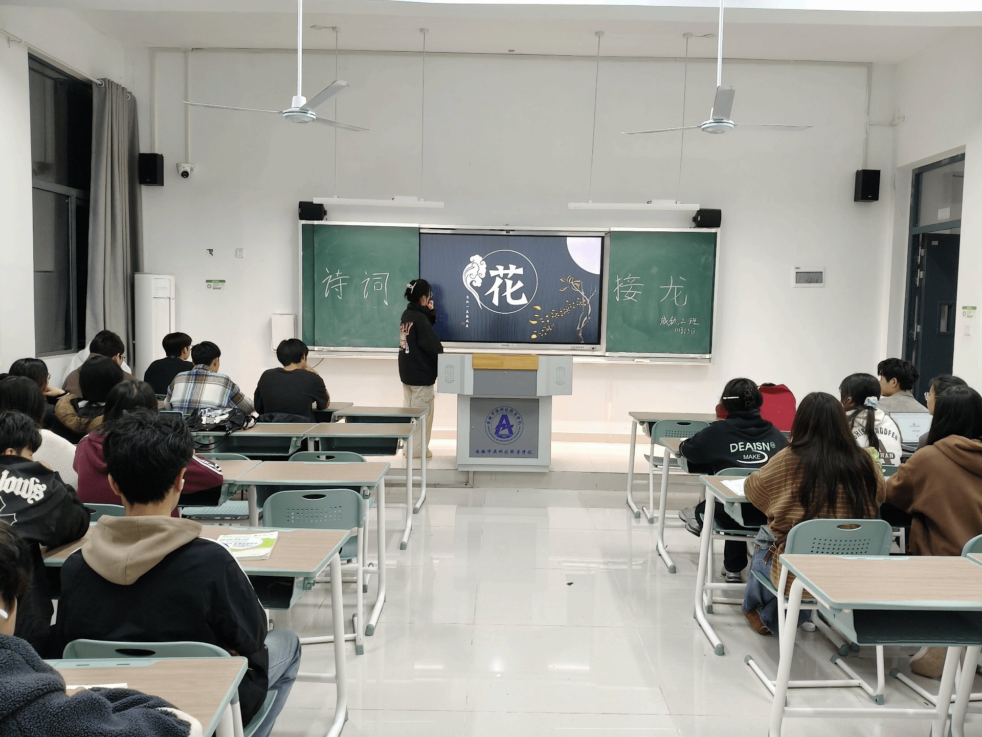 活动伊始,团支书王亚雪在黑板写下“诗词接龙”主题,屏幕上“花”字水墨设计更添古韵,同学们在教室中围坐,以“含‘花’诗句”为线索展开接龙。从“春风得意马蹄疾,一日看尽长安花”的畅意,到“忽如一夜春风来,千树万树梨花开”的盛景,从唐诗宋词到现代咏花佳句,大家在接句、补全、赏析的互动里,既重温了经典诗词,也在欢笑中拉近了距离。
