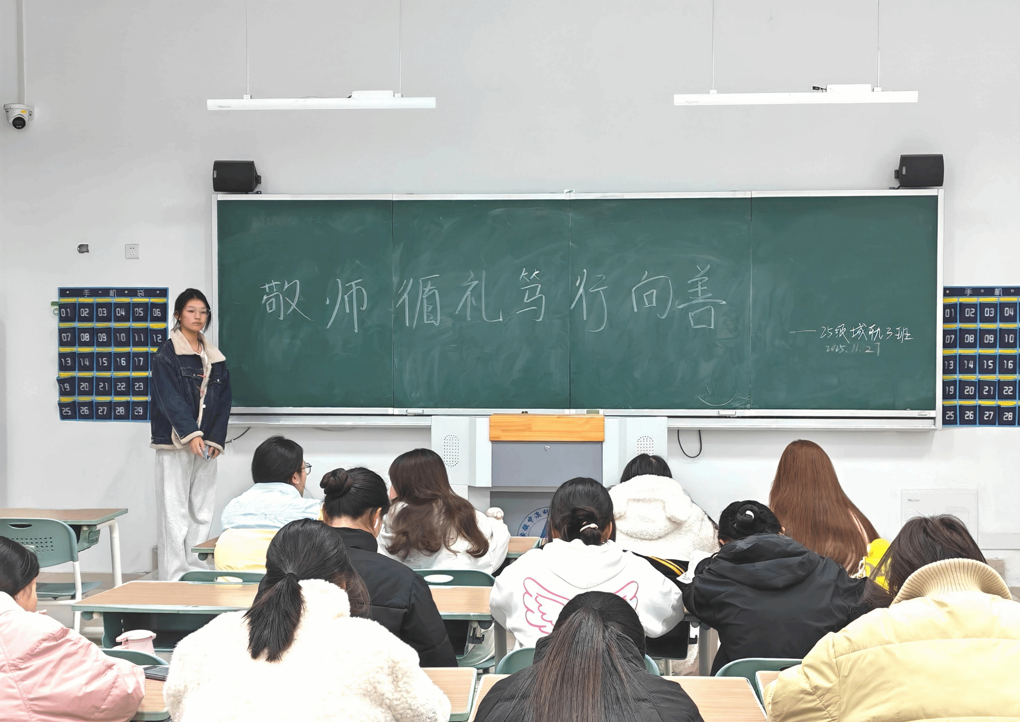 为了传承中华民族尊师重教的传统美德,培育学生崇德向善的良好风尚,引导青年学子以礼立身、以善践行,25级城轨3班于2025年11月27日晚,在教学楼A309教室开展“敬师循礼,笃行向善”主题班会活动。本次班会由团支书佘紫怡负责,全班共50名同学参与。
