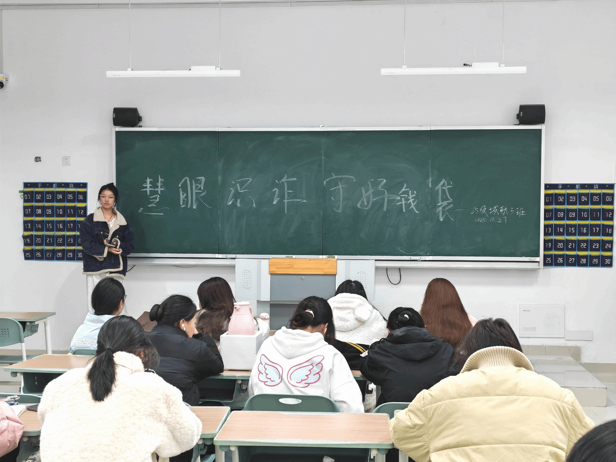 为了切实提高同学们的反诈防骗意识,增强自我财产保护能力,防范校园电信网络诈骗风险,引导青年学子树立正确消费观与安全观,25级城轨3班于2025年11月27日晚,在教学楼A309教室开展“慧眼识诈,守好钱袋”主题班会活动,本次班会由团支书佘紫怡负责,全班共50名同学参与。