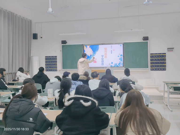 为培育同学们的感恩意识,传承中华传统美德,营造团结友爱的班级氛围,25级城轨4班于11月30日晚,在A310教室成功开展“懂得感恩 学会感恩”主题活动。本次班会由班委牵头策划,以PPT展示为核心载体,通过多维形式引导同学们感悟感恩内涵、传递真挚情感,共有40名同学参加。