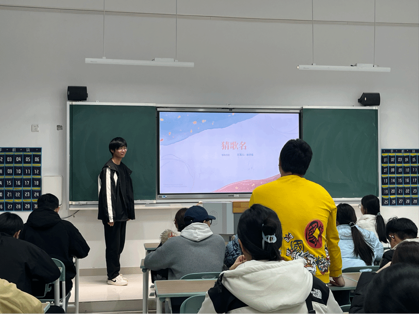 活动现场气氛热烈,同学们热情高涨。在“听歌抢答”环节,随着PPT中播放的熟悉旋律,大家纷纷举手抢答,有的同学仅凭前奏就能精准报出歌名,赢得现场阵阵掌声;“歌词接龙”环节中,组织委员赵香廷同学通过PPT展示歌词开头,同学们接龙接唱,考验着大家的歌曲储备与反应速度;“歌曲联想”环节则通过PPT呈现歌曲相关的场景描述、歌手信息等线索,让同学们发散思维猜测歌名,现场欢声笑语不断。班委们分工明确,有的负责操作PPT、播放歌曲,有的负责计分、维持秩序,确保活动有序推进。