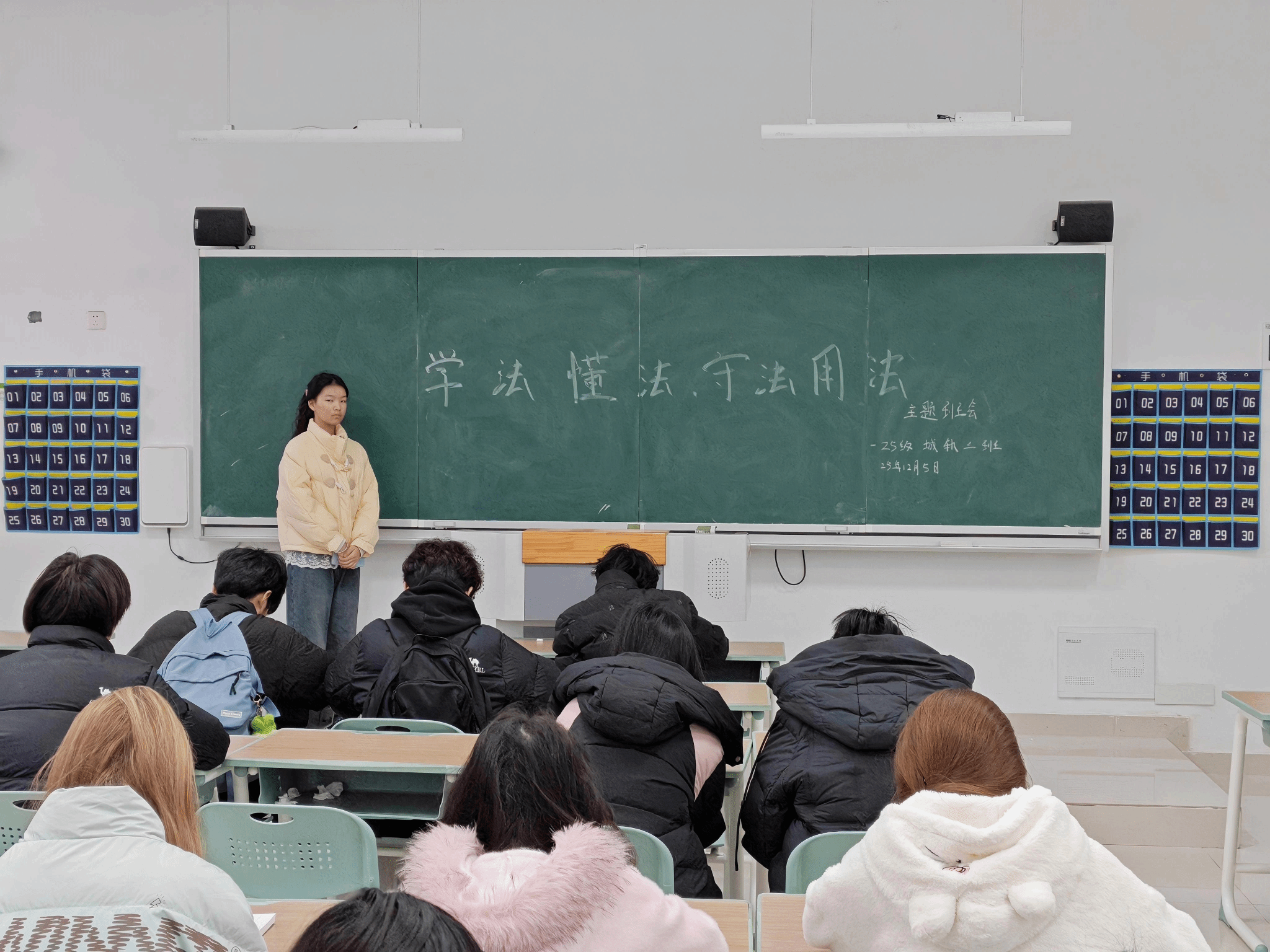 为了深入贯彻落实法治教育进校园的相关要求,增强当代大学生的法治观念和法律意识,引导学生树立正确的权利义务观,学会运用法律武器维护自身合法权益,25级城轨3班于2025年12月5日早,在教学楼A309教室开展“学法懂法,守法用法”主题班会活动。让同学们通过案例剖析、互动讨论、知识普及等多种形式,让法治理念深入人心。本次活动由团支书佘紫怡负责,全班共50名同学参与。