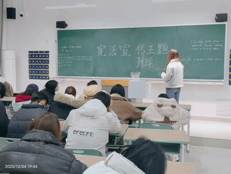 为深入学习贯彻习近平法治思想,增强班级同学的宪法意识和法治观念,引导青年学子树立正确的权利义务观,25级城轨4班于12月4日在A310教室举办“宪法宣传”主题班会,共有45名同学参加,班会由班委牵头组织,通过PPT讲解、案例分析、互动问答等丰富形式,让宪法知识走进校园、融入班级。