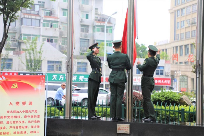 为庆祝中国共产党成立100周年,激发广大人民群众爱党爱国热情,进一步增强历史责任感、使命感和荣誉感,7月1日庐阳区人民政府在北一环财富广场举行升旗仪式。我院兵源预储班学生靖海涛、张子健和邵天佩参与仪式并担任护旗手。