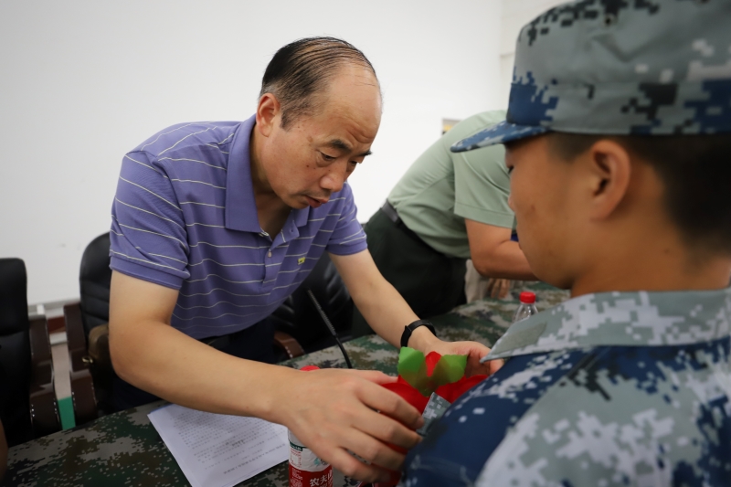 汪源浩代表学院为入伍大学生赠送纪念品、佩戴光荣花