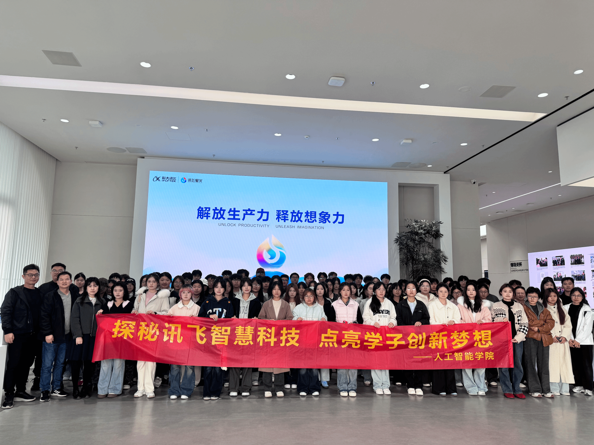 活动尾声,全体师生在“解放生产力 释放想象力”的主题背景前合影留念,为本次参观学习画上圆满句号。学生们纷纷表示,此次行程不仅拓宽了学术视野,更明晰了职业发展方向,未来将以更饱满的热情投入专业学习,为人工智能行业发展注入青春动能。
