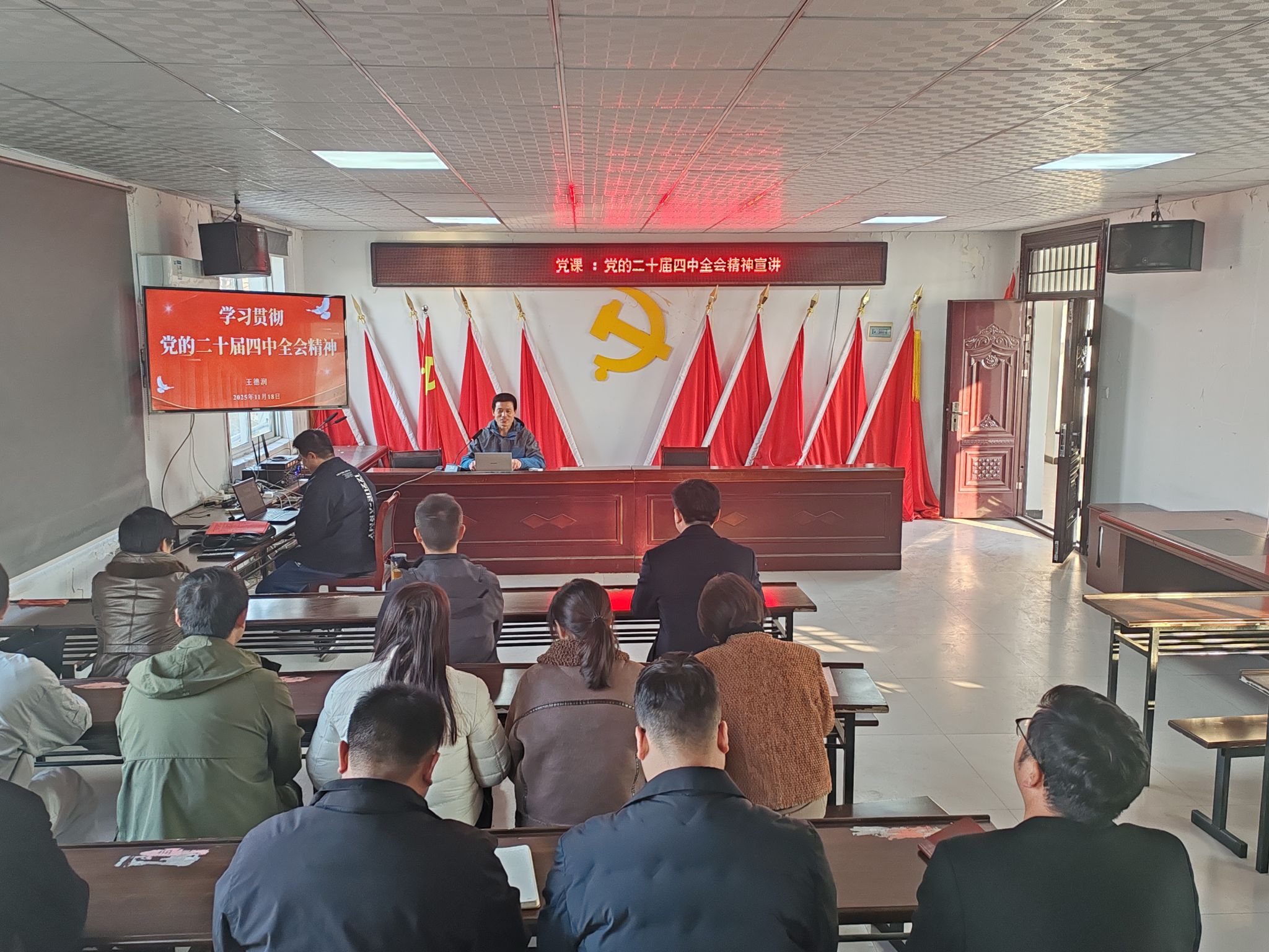 在张汪村会议室,王德润给镇村两级党员干部代表上专题党课,宣讲党的二十届四中全会关于加快农业农村现代化、扎实推进乡村全面振兴有关内容。