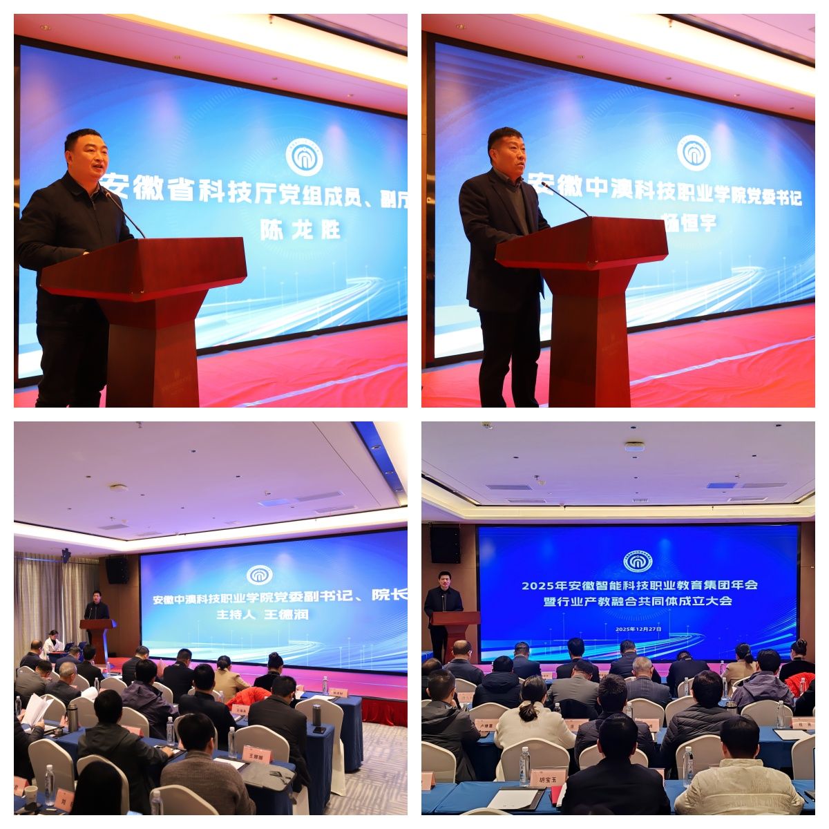 12月27日,由安徽省科技厅、安徽省教育厅指导,安徽中澳科技职业学院主办的安徽省智能科技职业教育集团年会暨行业产教融合共同体成立大会,在合肥成功召开。省科技厅党组成员、副厅长陈龙胜出席会议并讲话,教育部民族教育司原副司长、一级巡视员葛维威应邀出席。省教育厅职教处副处长詹生琪、兄弟院校相关领导、职业教育集团部分成员单位代表参加会议。会议由学院院长王德润主持。