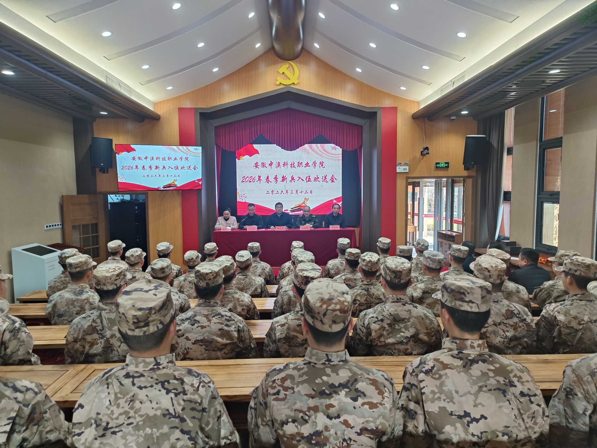 春风送暖,锣鼓催征;戎装加身,逐梦前行。为热烈欢送我校2026年春季入伍新兵踏上军旅征程,凝聚强军兴军青春力量,3月12日,我校在庐阳区委党校训练基地隆重举行新兵入伍欢送会,为即将奔赴军营的新战士们壮行。学校党委书记杨恒宇,庐阳区区委常委、人武部上校政委刘泽生,四里河街道党工委书记阚海峰、亳州路街道党工委书记胡晓玲、学校学生处负责人出席欢送会。会议由学校党委委员、副校长卢继富主持。