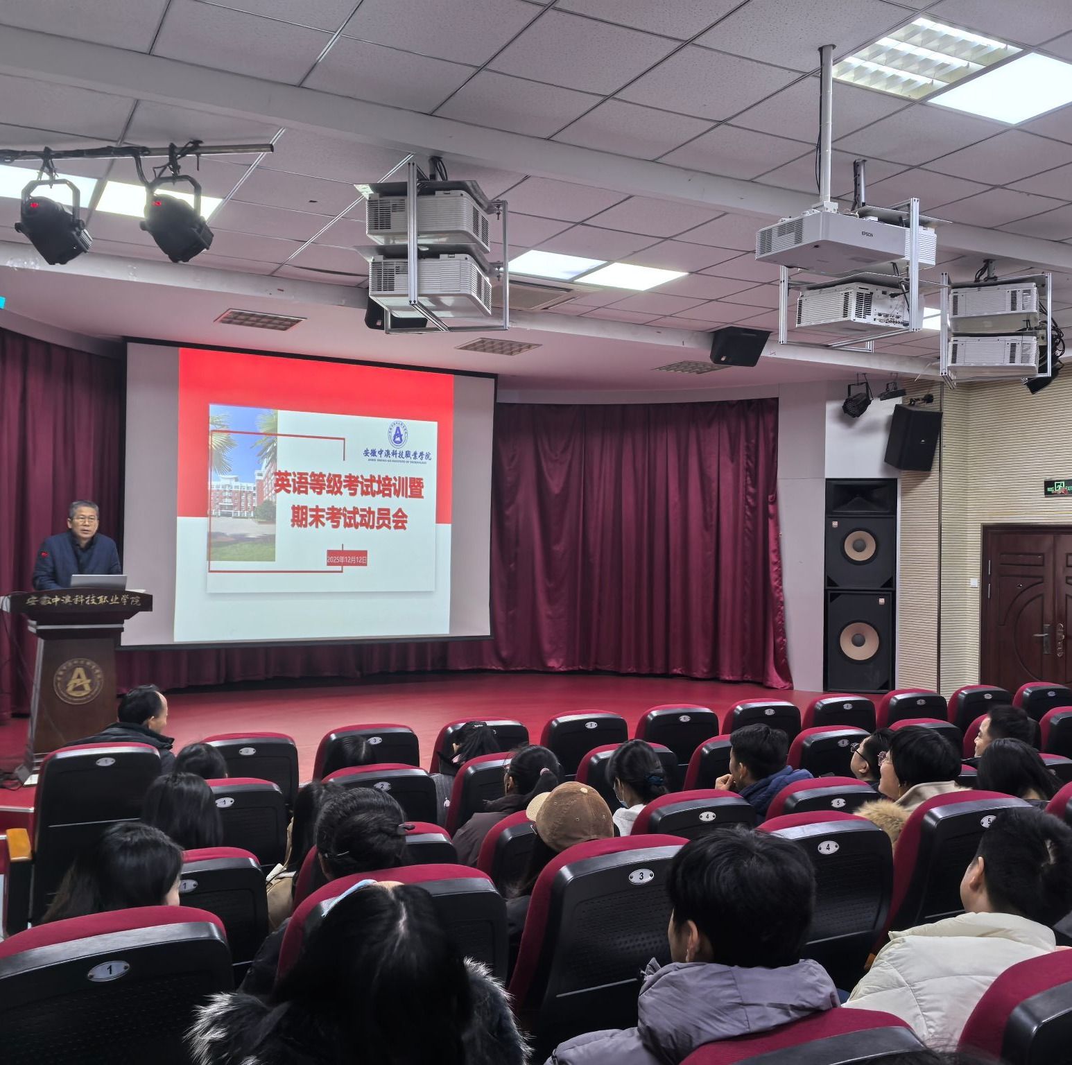 为进一步做好本学期全国大学英语四六级考试和学期期末考试工作,确保考试的顺利进行,我院于12月12日下午在庐阳校区学术报告厅召开考试动员培训大会。本学期专兼职教师、全体考务人员参加了此次大会,会议由副院长刘超主持。