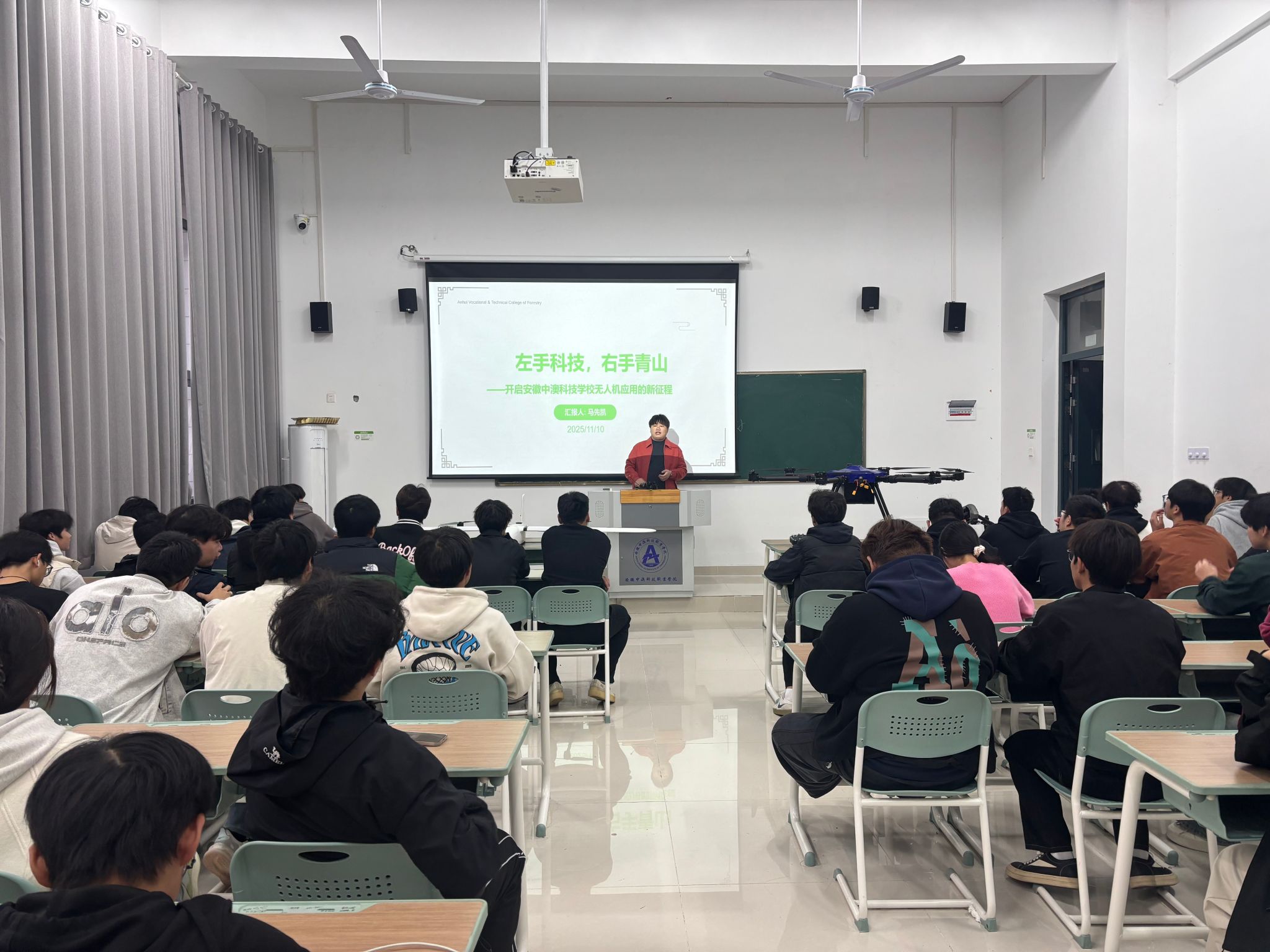 2025年11月11日,人工智能学院无人机应用技术专业在教学楼A107举办“左手科技,右手青山——开启无人机应用新征程”专题讲座。学院邀请蓝航天际无人机科技有限公司的专家马先凯结合技术应用与职业发展,为在场师生解析了无人机生态领域的就业与成长路径。