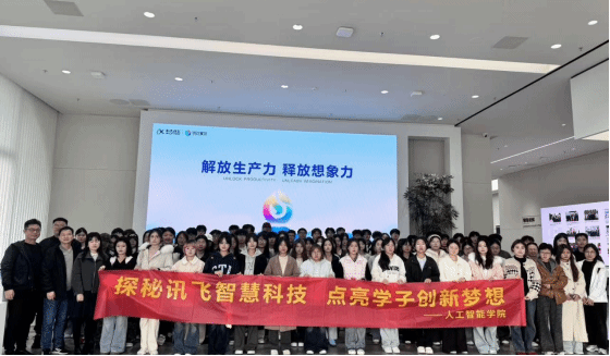 参观过程中,学生们还深入了解了科大讯飞在认知智能领域的科研成果,以及人工智能如何赋能生活、教育、医疗等场景。沉浸式的体验让大家对人工智能行业的发展前景有了更直观、深刻的认识,也进一步激发了专业学习的热情与创新探索的动力。活动最后,全体师生在 “解放生产力 释放想象力” 的主题背景前合影留念,为本次参观学习画上圆满句号。参与活动的学生代表表示,此次参观不仅开阔了视野,更清晰了职业发展方向,未来将以更饱满的热情投入到专业学习中,为人工智能领域发展贡献青春力量。