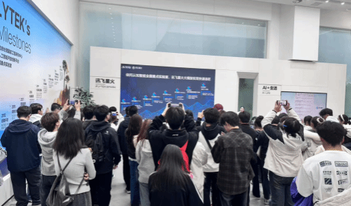 在造型现代的科大讯飞 AI 体验馆,学生们开启了一场人工智能的探索之旅。讲解员带领大家依次参观了“AI + 生活”等展区,详细介绍了讯飞星火大模型的发展历程、技术优势及在多个领域的创新应用。从人工智能发展史上的里程碑事件,到讯飞星火大模型的快速迭代进程,学生们认真聆听、积极互动,纷纷用手机记录下关键信息与精彩瞬间。