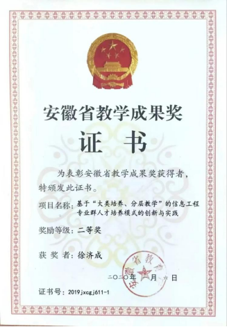 教学成果斐然。专业建设方面荣获安徽省级教学成果二等奖1项,安徽省第六届校企合作典型案例二等奖1项。近3年来,指导学生在省级技能竞赛中获一等奖2项,二等奖3项,在国家级创新大赛中获铜奖1项,获得省级创新大赛、职业规划大赛金奖各1项。