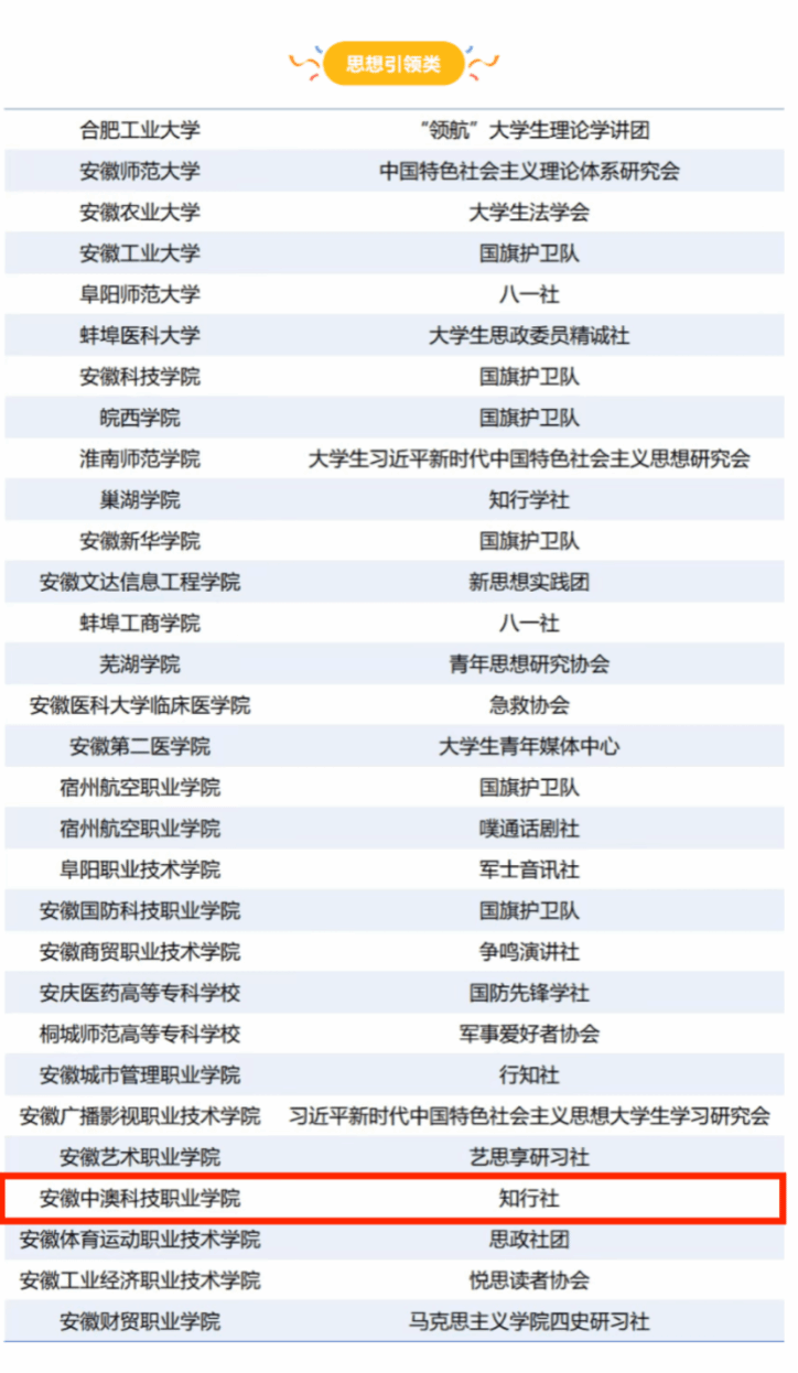 近日,由共青团安徽省委、安徽省学生联合会联合开展的2024-2025学年安徽省高校联通杯“活力社团”评选结果正式公布。经层层推荐、严格评审,马克思主义学院社团“知行社”凭借扎实的思想引领基础、丰富的实践育人活动和突出的组织凝聚力,成功入选“活力社团”名单,成为全省高校中展现青年担当、弘扬时代精神的优秀学生社团代表之一!