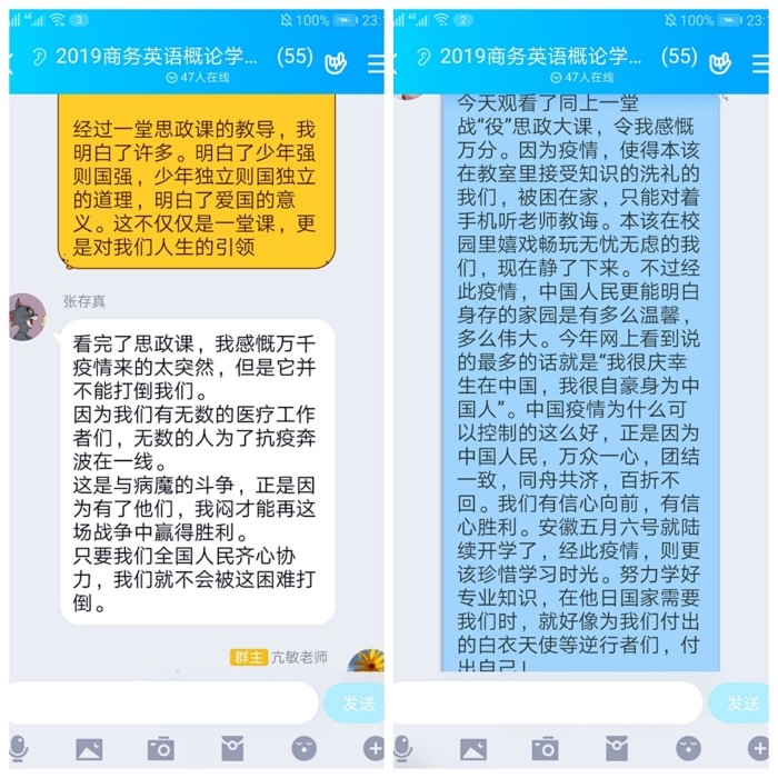 2018级空中乘务班的陈旭龙樱表示,看了今天的抗疫思政大课后,我看到每一个抗疫战士身上闪闪发光的小故事,他们舍小家而为大家,在不知生死的情况下毅然决然离开自己的父母孩子,为了祖国他们无畏,这正是“苟利国家生死以岂因祸福避趋之”,我们是中国青年,更是共青团员,代表着中国最青春的力量,我们应当为祖国而学习,以国家为重,收起少年心性,永葆少年志气。