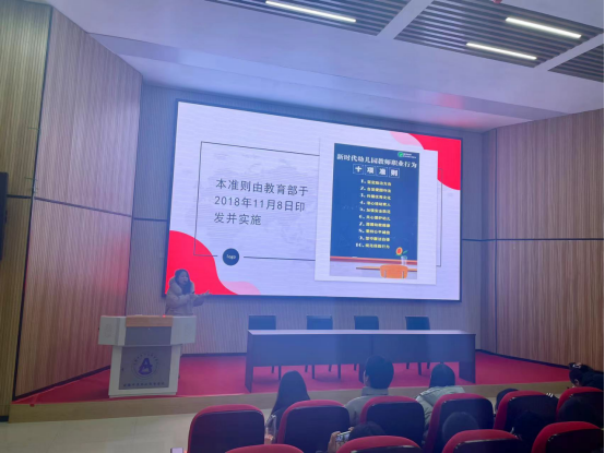 随后,汤佩老师以幼儿园师德现状为主题,从《幼儿园教师专业标准》《新时代幼儿教师职业行为十项准则》以及《中华人民共和国学前教育法(草案)》的规定出发,用了大量的案例,生动形象的解析了什么是高尚的师德?什么是师德缺失?引导学生成为孩子喜欢、家长信任、社会满意的好老师。
