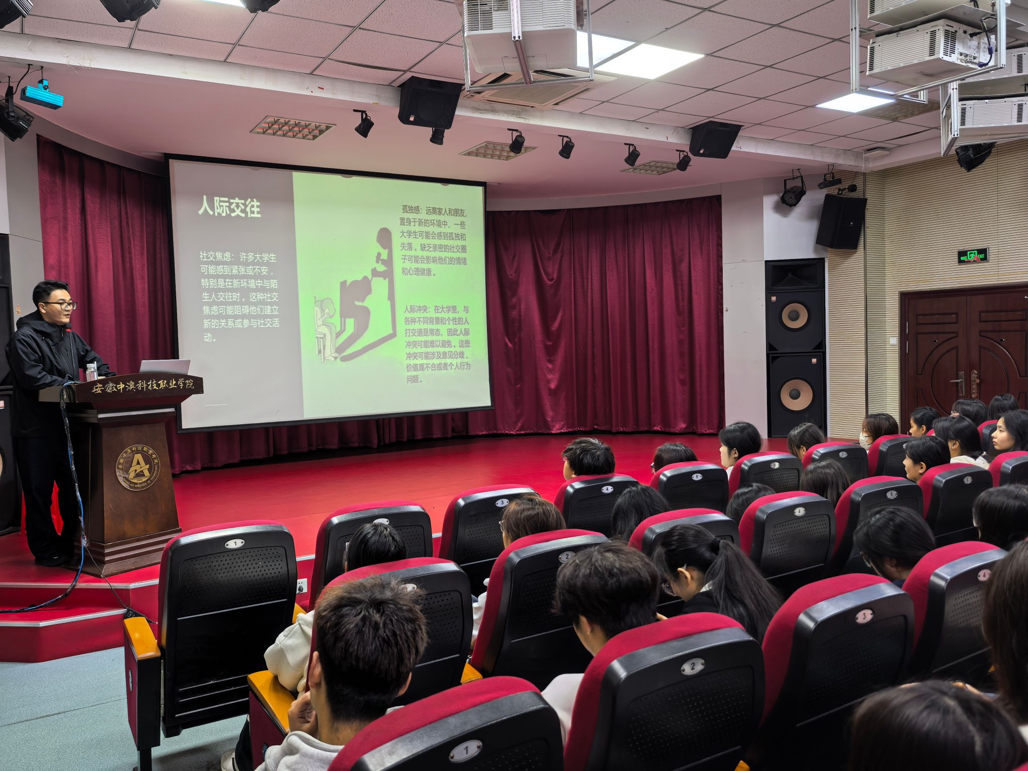 为精准破解新生在人际交往、学业压力、情绪管理等适应期核心心理难题,帮助2025级新生快速融入大学生活、筑牢心理健康防线,学生处心理健康教育中心主动联动合肥市第四人民医院(安徽省精神卫生中心),以医教协作为核心模式,特别策划“心迹之旅——大学生心理健康与自我调适”专题讲座,为新生心理健康保驾护航。讲座分校区有序开展,10月29日晚18:30在庐阳校区3D报告厅率先开讲,11月5日下午14:00在新桥校区B2-401接续举办,两场活动共吸引近300名在校学生积极参与。 本次讲座特邀合肥市第四人民医院、安徽省精神卫生中心主治医师、心理治疗师郑明明博士担任主讲嘉宾,充分发挥专业医疗机构在心理诊疗领域的资源优势与临床经验,将医疗级专业指导与校园新生心理需求深度结合,为新生带来兼具科学性与实用性的心理健康课程。结合新生适应期的心理特点,郑博士围绕人际交往适应、大学生活融入、情绪自我调控、学业规划落地、恋爱关系处理五大核心议题,展开系统且接地气的讲解,内容直击新生适应过程中的痛点难点,让“医教协作”的专业价值贯穿讲座全程。 讲座以“新生为何更需关注心理健康?”为切入点,郑博士结合当下大学生尤其是新生群体中普遍存在的社交焦虑、学业迷茫、情绪波动、睡眠困扰等现象,依托临床诊疗中的真实案例,深入剖析心理健康对新生完成角色转变、实现个人成长与长远职业发展的基础性作用。他具象化呈现心理问题的形成逻辑,详细拆解抑郁症早期识别信号、睡眠障碍自我调节技巧、多层级压力应对策略等实用内容——既传递医疗领域的专业知识,又贴合校园生活场景,引导新生树立“心理问题可防可治、心理求助是勇敢的选择”的科学观念,真正让“医教协作”的成果惠及新生。互动环节中,新生们踊跃举手提问,“如何快速打破社交壁垒、缓解陌生环境带来的焦虑?”“专业课压力大导致失眠,该怎么调整?”“面对未来就业竞争,如何避免过度焦虑?”等问题直击适应期困惑。郑博士凭借丰富的临床经验,将医疗级心理调适方法转化为新生易懂易用的技巧,耐心解答每一个疑问。现场氛围轻松热烈,交流互动频繁,“医教协作”在答疑环节的优势被充分激活,让新生感受到专业医疗支持与校园关怀的双重温暖。