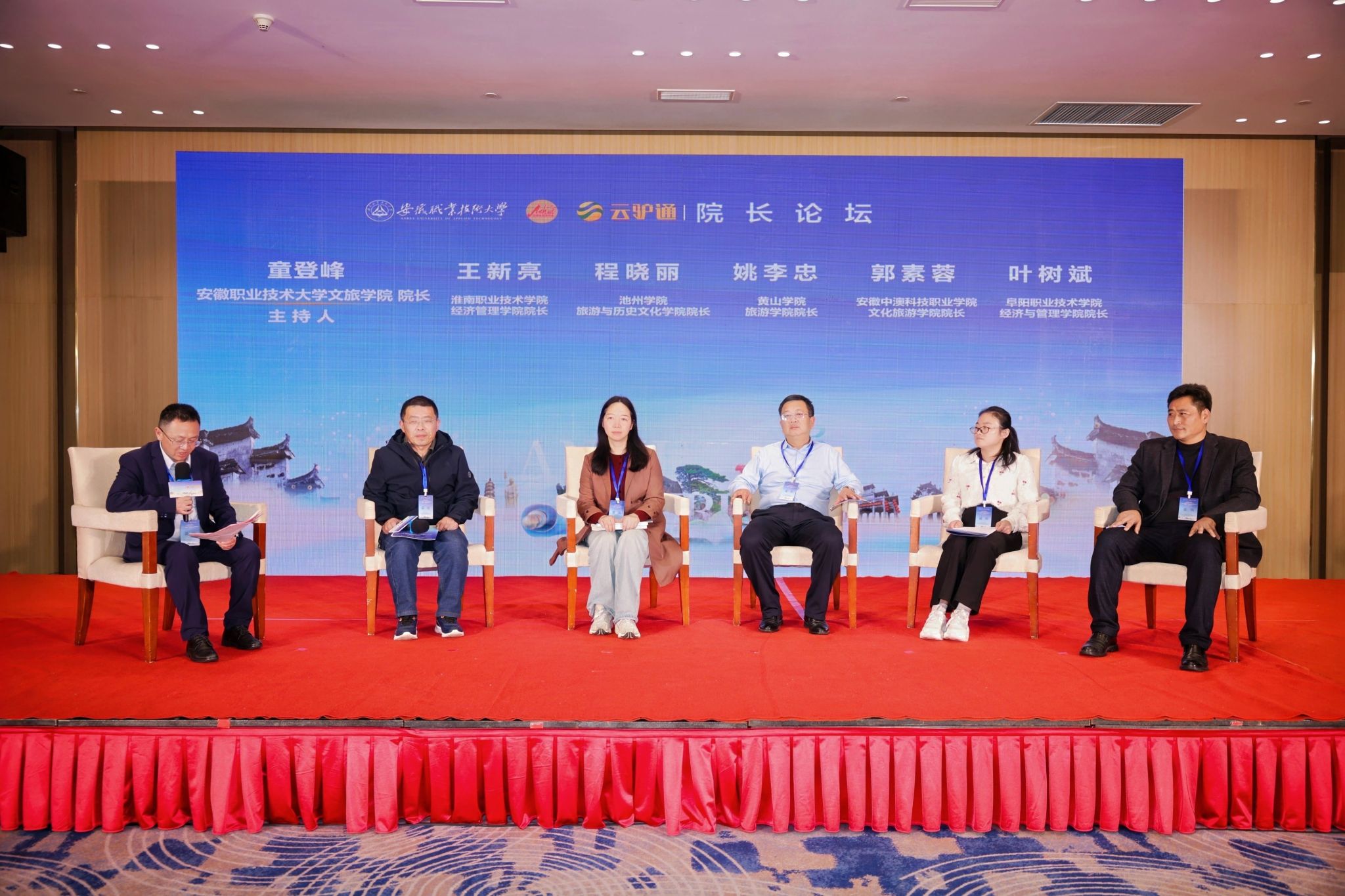 当日下午,年会设置的三大圆桌论坛同步开展,其中院长论坛由安徽职业技术大学文旅学院院长童登峰主持,我院院长郭素蓉与淮南职业技术学院经济管理学院院长王新亮、池州学院旅游与历史文化学院院长程晓丽、黄山学院旅游学院院长姚李忠、阜阳职业技术学院经济与管理学院院长叶树斌6所高校文旅领域负责人同台交流。论坛上,郭素蓉院长结合我院文旅专业建设实践,围绕产教融合人才培养模式创新、实践教学体系与行业需求对接、校企协同育人机制构建等关键问题分享经验见解,与参会嘉宾深入探讨,现场交流氛围热烈,形成多项共识。