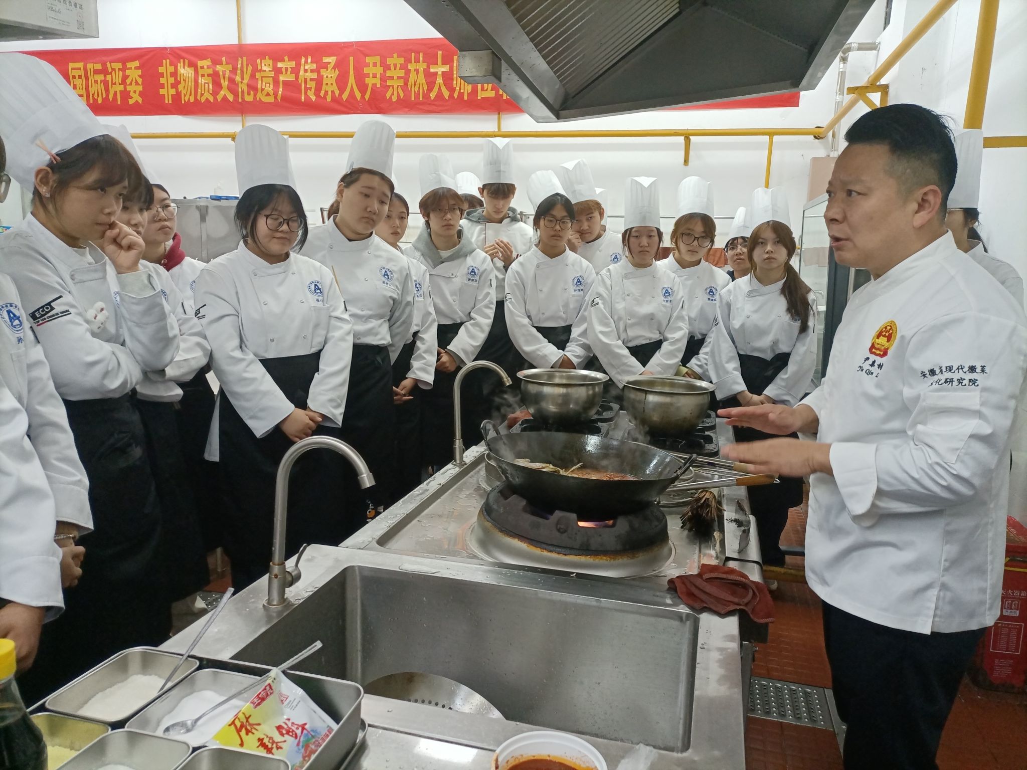 12月8日上午,一场别开生面的徽菜文化盛宴在学院烹饪工艺与营养专业实训室精彩上演。中国烹饪大师尹亲林受邀走进校园,以“成长分享+文化解读+技艺演示”的多元形式开展活动,学院副院长刘超、文化旅游学院院长郭素蓉亲临活动现场,和师生们一起近距离感受徽菜的独特魅力,解锁传统美食背后的文化密码与匠心精神。