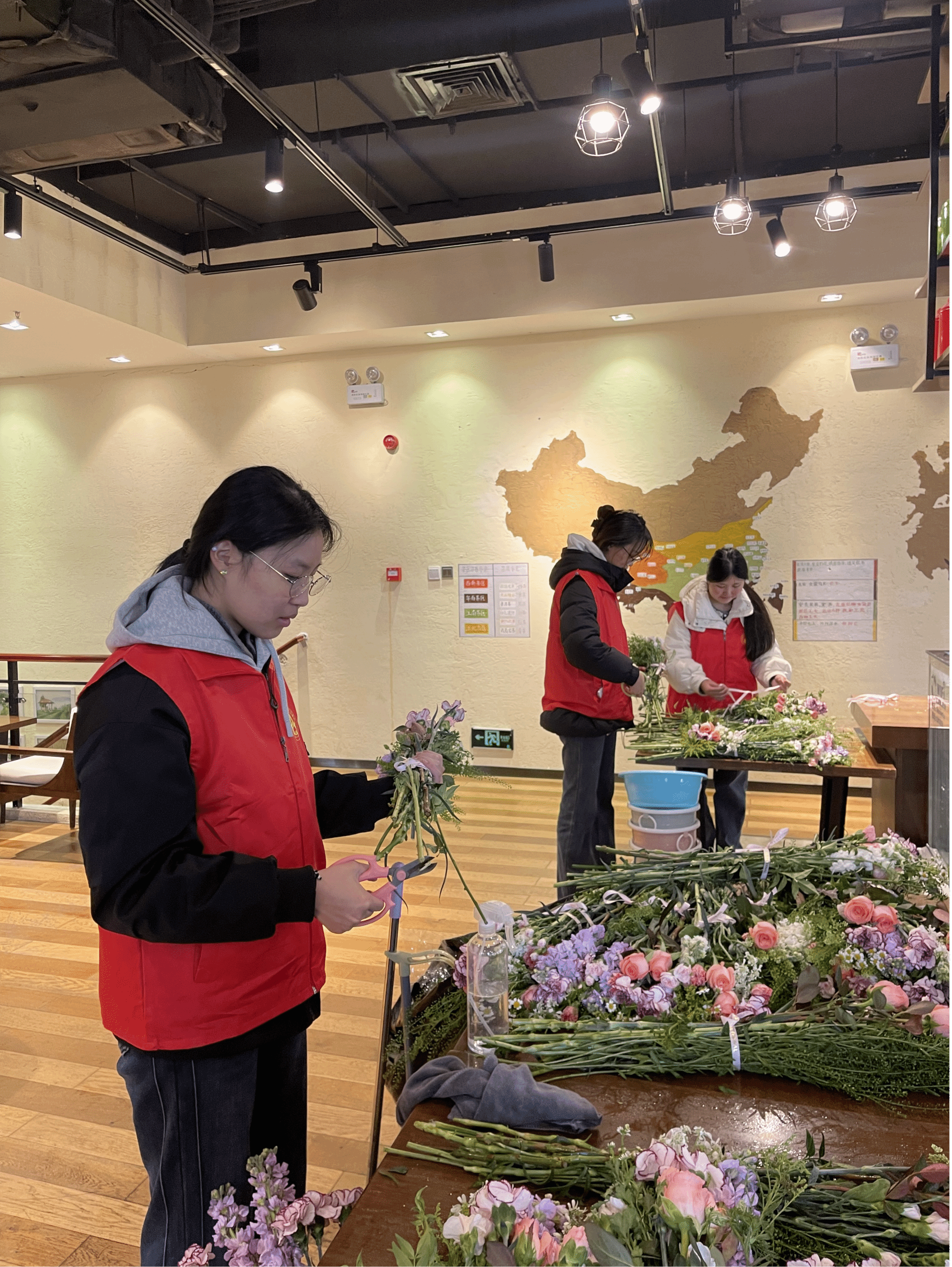 三月春风暖,志愿正当时。“3月5日学雷锋纪念日”到来之际,为弘扬志愿精神,发挥专业育人与非遗传承优势,文化旅游学院主动担当,依托徽派插花传承基地,3月5日下午,专业教师带领学生志愿者走进祥源广场楼宇社区,参与楼事会“茶香花韵·巾帼芳华”三八节主题活动,传承徽派花艺,践行雷锋精神,为楼宇女职工送节日温暖。