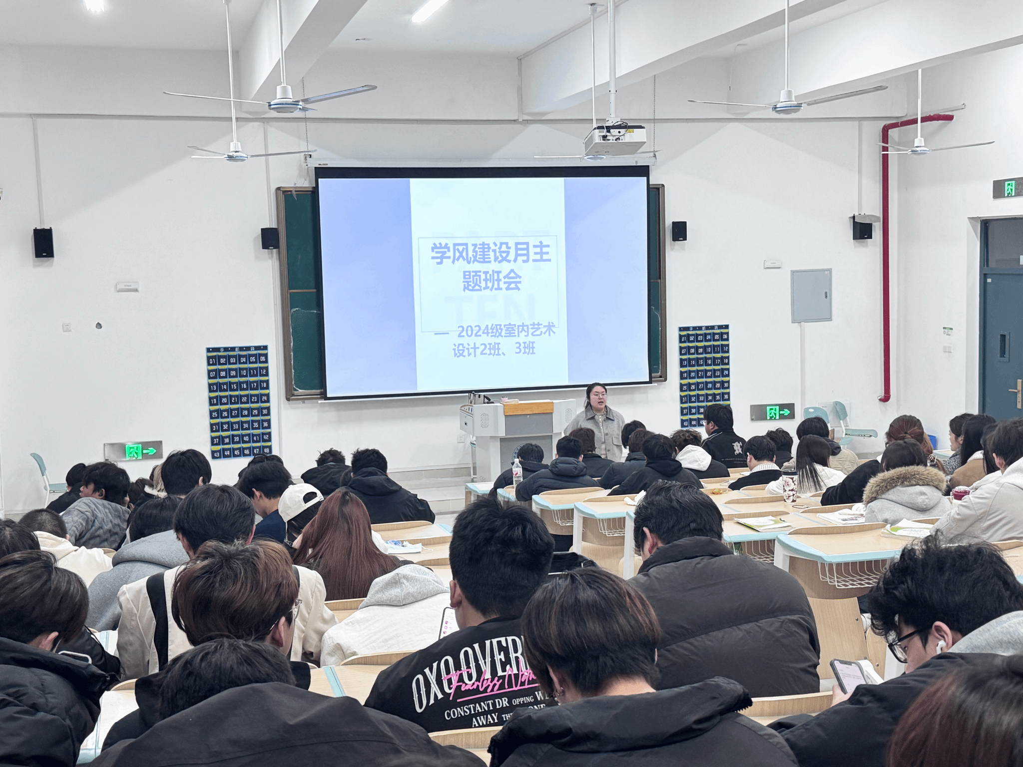 为营造勤奋学习、善于思考、求真务实的班级学习环境,激发学生的学习热情与进取精神,2024级室内艺术设计2班和3班于11月25日举办了学风建设月主题班会。本次班会由辅导员刘凯丽老师主持,全体同学参与。