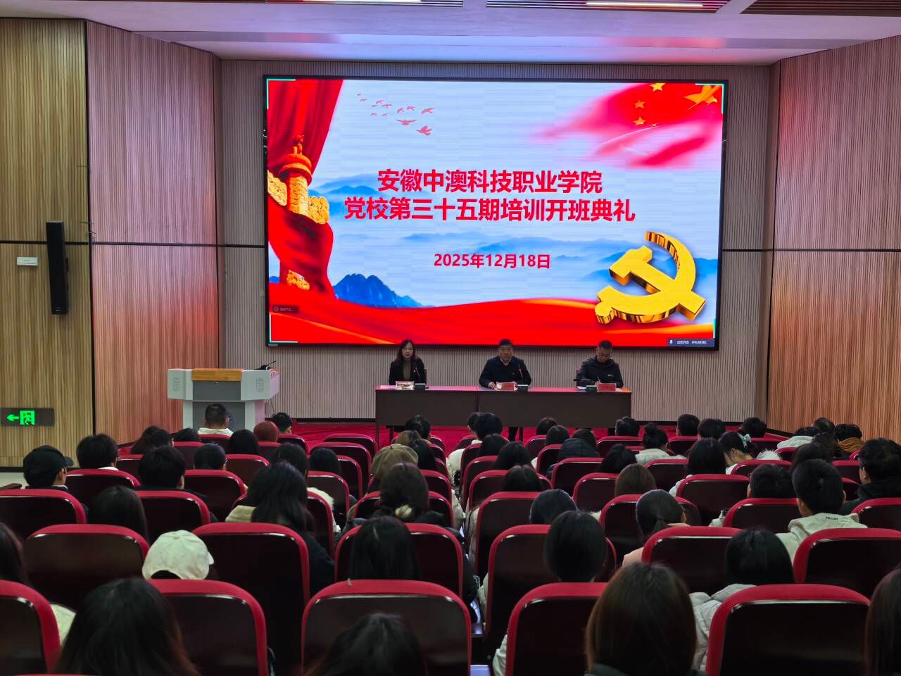 12月18日上午,学院党校第35期入党积极分子培训班开班仪式在庄严的国歌声中正式拉开帷幕。院党委书记杨恒宇,党委委员、副院长李钟、卢继富,各二级学院党总支书记、学生党支部书记,以及来自各二级学院的80余名入党积极分子参加了本次仪式。开班仪式由组织人事处处长付丽丽主持。